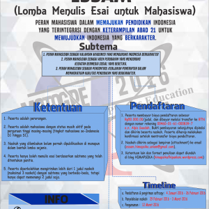 Lomba ESSAM (Esai Mahasiswa) adalah lomba menulis esai yang diselenggarakan oleh Himpunan Mahasiswa Pendidikan Fisika Universitas Lambung Mangkurat. Peserta lomba ini adalah mahasiswa dari tingkat D1 sampai S1 yang masih aktif di seluruh Indonesia. Syarat …
