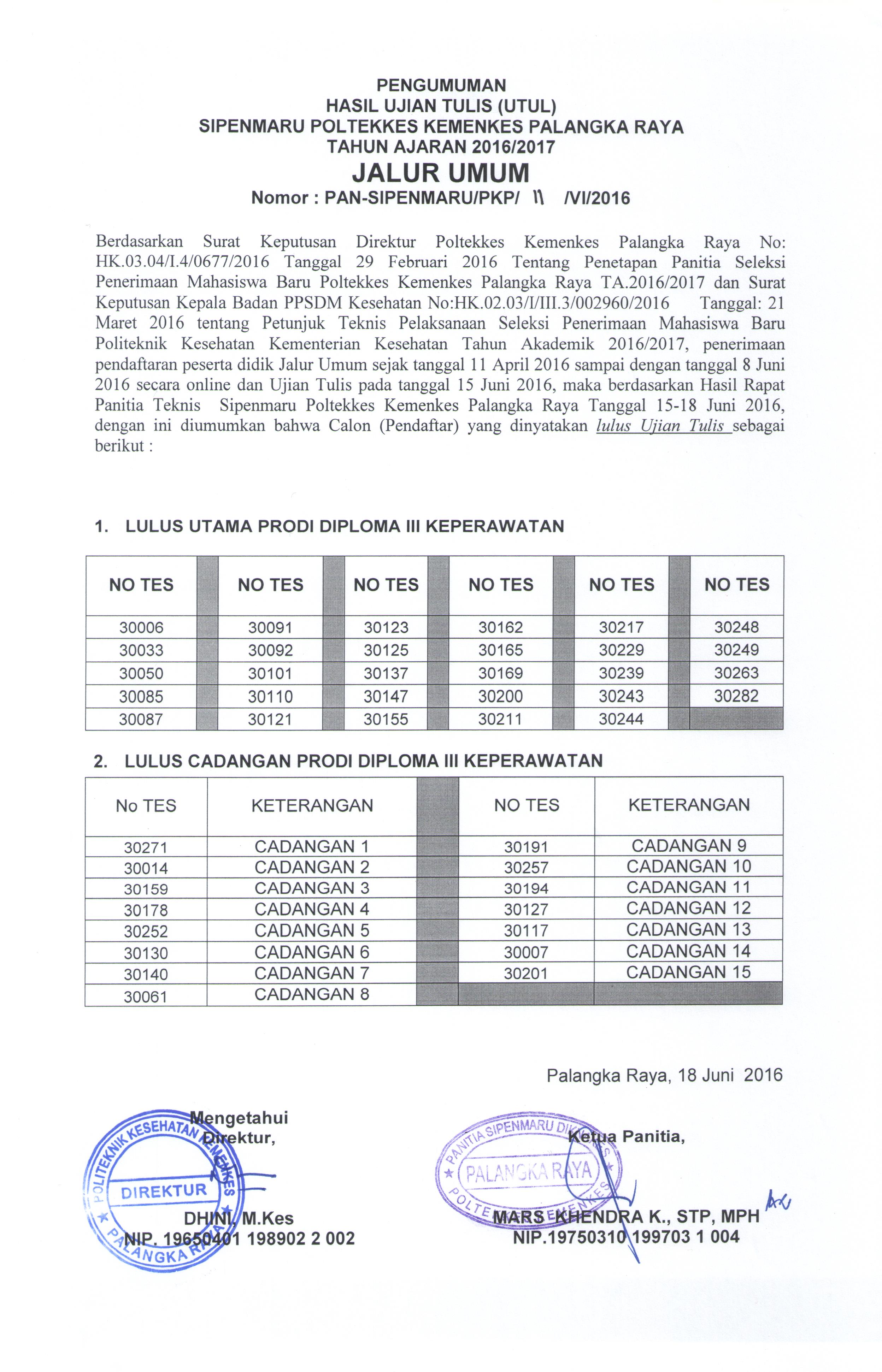 PENGUMUMAN HASIL TEST KESEHATAN / PSIKOTES/ WAWANCARA SIPENSIMARU POLTEKKES KEMENKES PALANGKA RAYA TAHUN AJARAN 2015 / 2016 JALUR UMUM, GAKIN, DAN DTTRK PENGUMUMAN HASIL TEST KESEHATAN / PSIKOTES/ WAWANCARA LULUS CADANGAN SIPENSIMARU POLTEKKES KEMENKES PALANGKA …