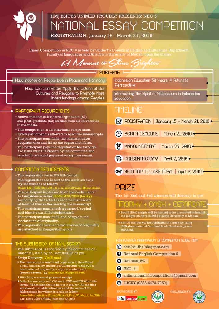 ESSAY COMPETITION - NATIONAL ENGLISH COMPETITION 5 Posted by Bagus Indriatmojo Categories Lomba Mahasiswa Date 1 February 2016 Comments 0 comment Deadline 4 Maret 2016 Info Selengkapnya : Silahkan di buka Share: Bagus Indriatmojo Admin Web Poltekkes Previous post Essay Competition LPM Motivasi FKIP UNS 1 February 2016 Next post ISLAMIC PAPER COMPETITION 1437 H 1 February 2016 You may also like PEMILIHAN MAHASISWA BERPRESTASI POLTEKKES KEMENKES PALANGKA RAYA TAHUN 2016 5 August, 2016 Lomba Menulis Artikel Ilmiah Populer (Exp Date : 25 Juni) 3 May, 2016 Lomba Pekan Esai dan Poster Al-Quran 2016 (PENS) 21 March, 2016