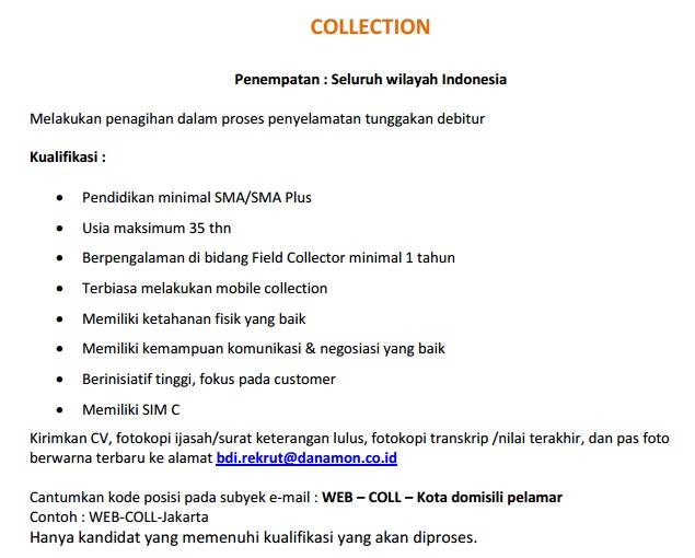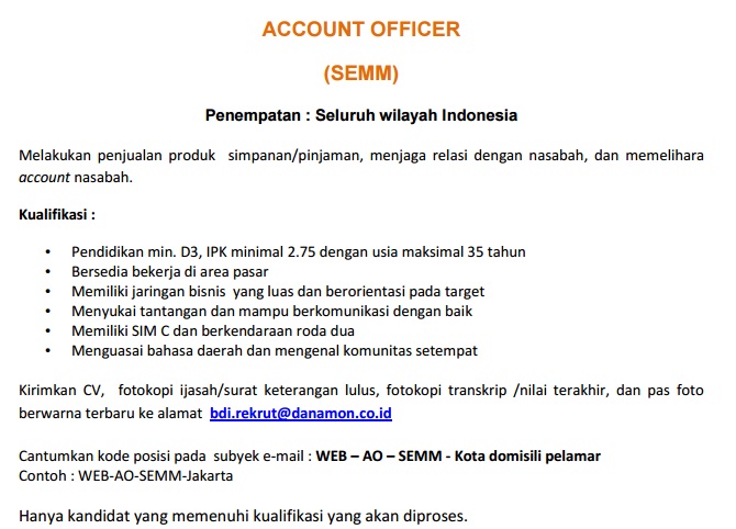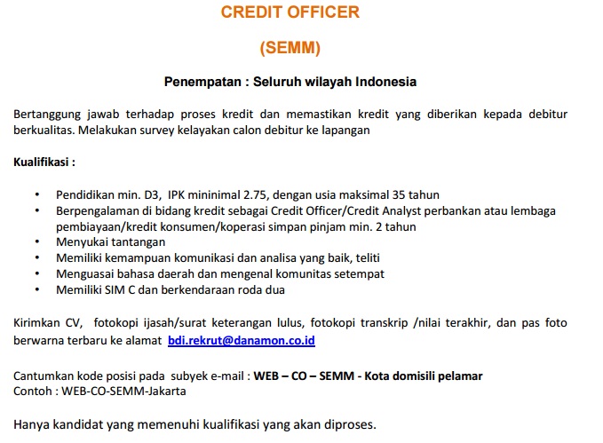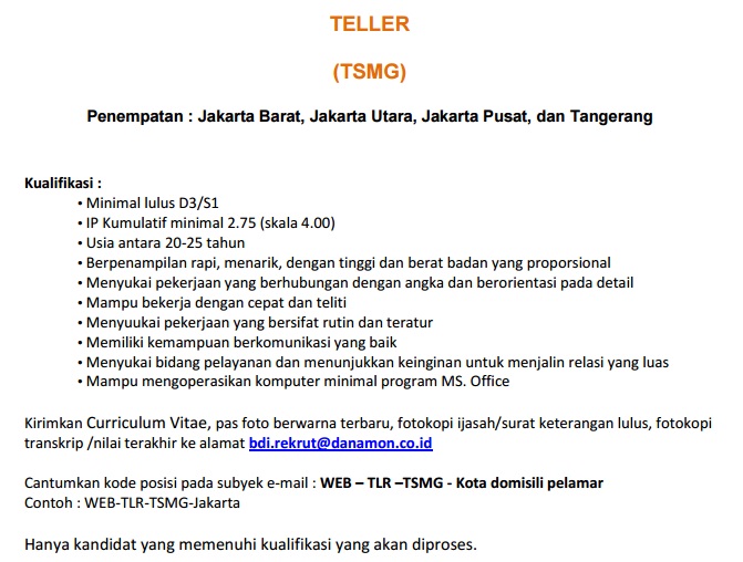 Loker Bank Danamon - Berbagai Posisi (Exp Date Secepatnya) Posted by Arif Adiguna Categories Loker BUMN Date 22 January 2016 Comments 0 comment Sumber : http://www.danamon.co.id/karir.aspx Tag:bank, Loker, Lowongan Share: Arif Adiguna Admin Web Poltekkes Previous post Sosialisasi PILGUB Kalteng 27 Januari 2016 22 January 2016 Next post CSR Telkom - Kuala Kapuas (Exp Date 25 Jan 2016) 23 January 2016 You may also like Asisten Frontliner (Teller) BNI - Min D3 Semua Jurusan (Exp Date : 8 Juni) 25 May, 2016 Penerimaan Pegawai (Tahap I) BPJS Kesehatan Tahun 2016 (Exp Date : 18 Mei) 14 May, 2016 Penerimaan Pegawai Reguler (berbagai posisi) - BPJS Ketenagakerjaan (Exp Date : 9 April) 4 April, 2016