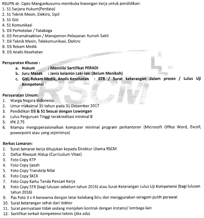 - Lamaran di kirim melalui email ke karir@rscm.co.id dengan format PDF maksimal ukuran 7MB.