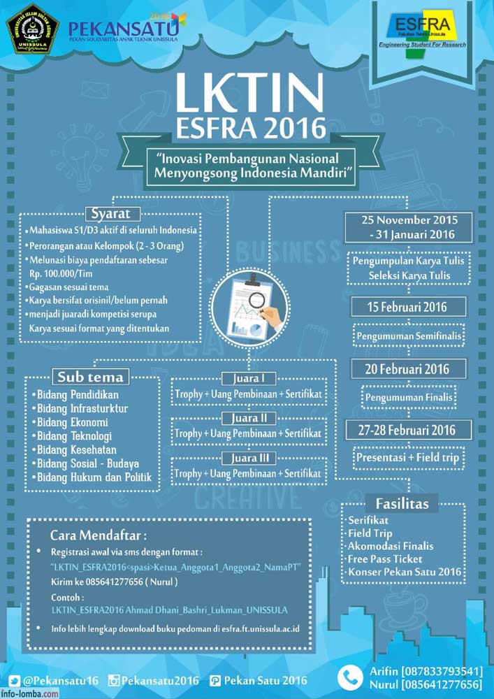 Lomba Karya Tulis Ilmiah Nasional ESFRA 2016 Posted by Bagus Indriatmojo Categories Lomba Mahasiswa Date 1 February 2016 Comments 0 comment Deadline 15 Februari 2016 (Diperpanjang) Info Selengkapnya : Info Lomba Tag:lomba, mahasiswa Share: Bagus Indriatmojo Admin Web Poltekkes Previous post Info CPNS 2016 1 February 2016 Next post Essay Competition LPM Motivasi FKIP UNS 1 February 2016 You may also like PEMILIHAN MAHASISWA BERPRESTASI POLTEKKES KEMENKES PALANGKA RAYA TAHUN 2016 5 August, 2016 Lomba Menulis Artikel Ilmiah Populer (Exp Date : 25 Juni) 3 May, 2016 Lomba Pekan Esai dan Poster Al-Quran 2016 (PENS) 21 March, 2016