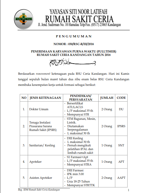Penerimaan Karyawan Purna Waktu RS Ceria Kandangan (Exp Date : 27 April) Sumber : http://www.rsceria.net/ By Arif Adiguna | 16 March 2016 | LokerKementerian | 0 Comments |