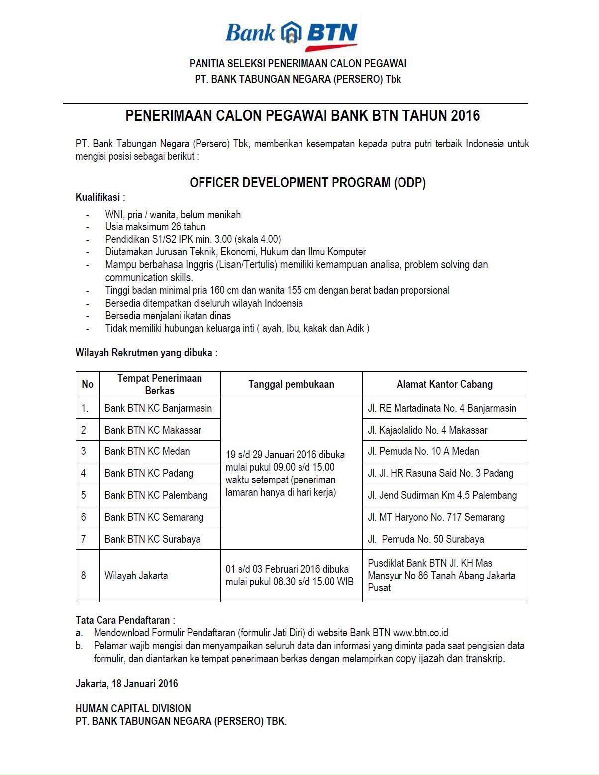 Penerimaan Calon Pegawai Bank BTN 2016 (Exp Date 29 Jan 2016) Posted by Arif Adiguna Categories Loker BUMN Date 21 January 2016 Comments 0 comment Tag:bank, Loker, Lowongan Share: Arif Adiguna Admin Web Poltekkes Previous post Penerimaan Calon Tenaga Kesehatan Tahun 2016 (Exp Date 9 Feb 2016) 21 January 2016 Next post CSR Telkom - Palangka Raya (Exp Date 10 Feb 2016) 21 January 2016 You may also like Asisten Frontliner (Teller) BNI - Min D3 Semua Jurusan (Exp Date : 8 Juni) 25 May, 2016 Penerimaan Pegawai (Tahap I) BPJS Kesehatan Tahun 2016 (Exp Date : 18 Mei) 14 May, 2016 Penerimaan Pegawai Reguler (berbagai posisi) - BPJS Ketenagakerjaan (Exp Date : 9 April) 4 April, 2016