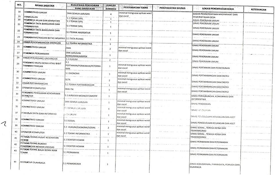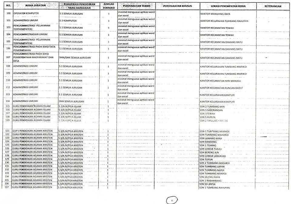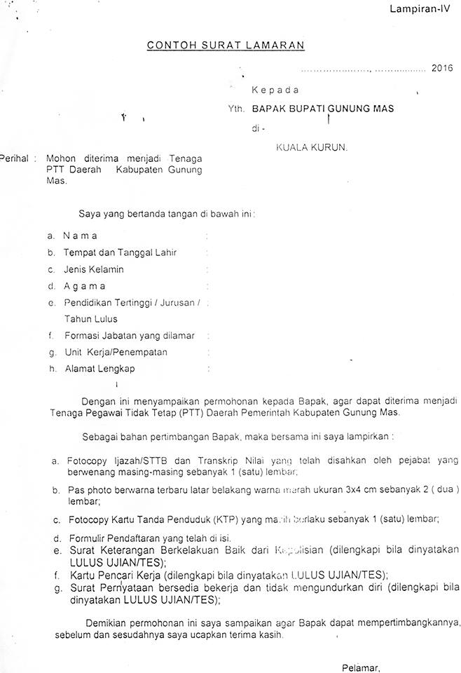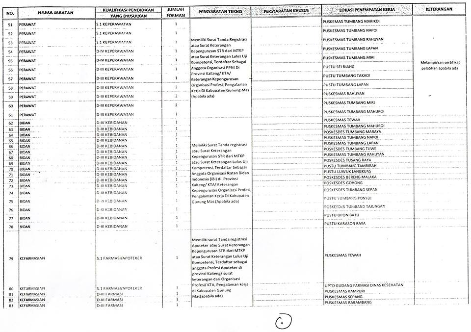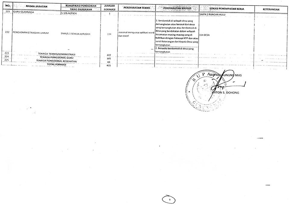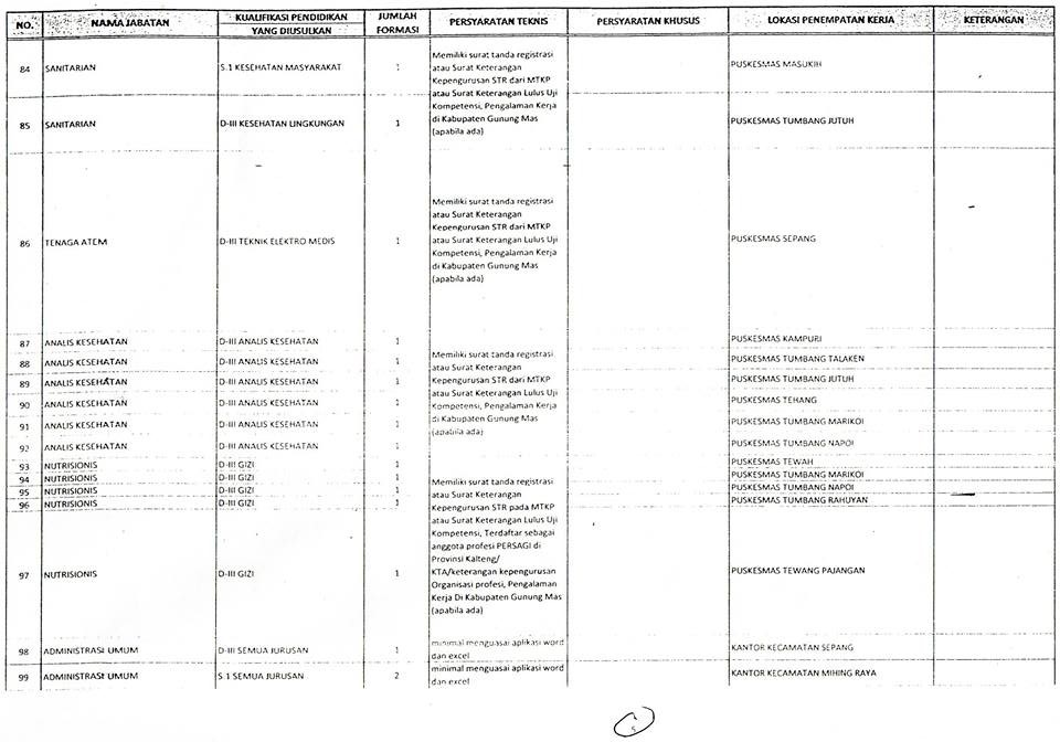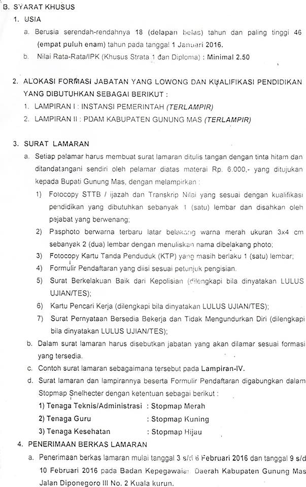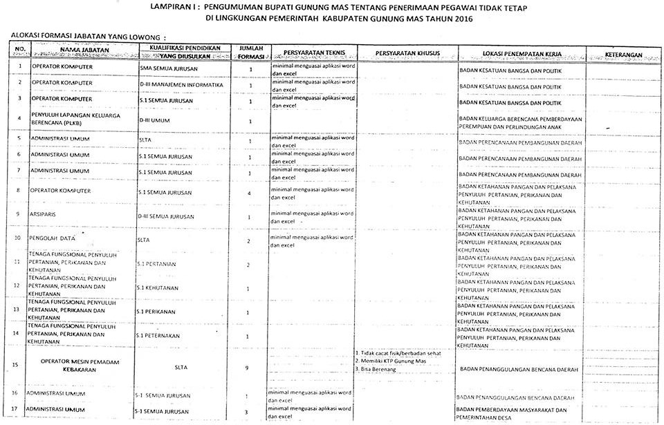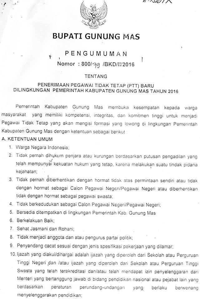 Penerimaan Pegawai Tidak Tetap (PTT) di lingkungan Pemerintahan Kab. Gunung Mas (415 orang) Tenaga Kesehatan, Teknis/Administrasi dan Guru (Exp 3-6 Feb 2016)