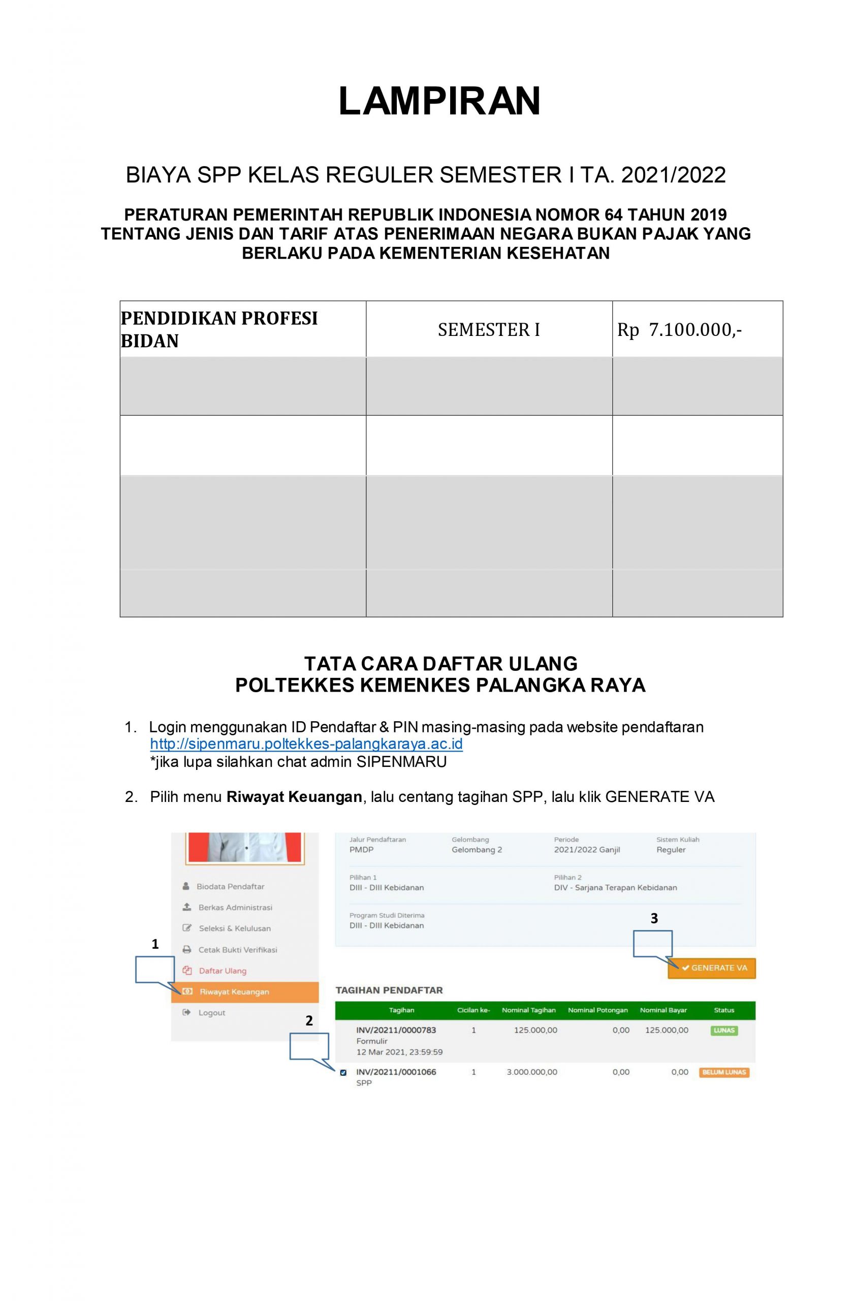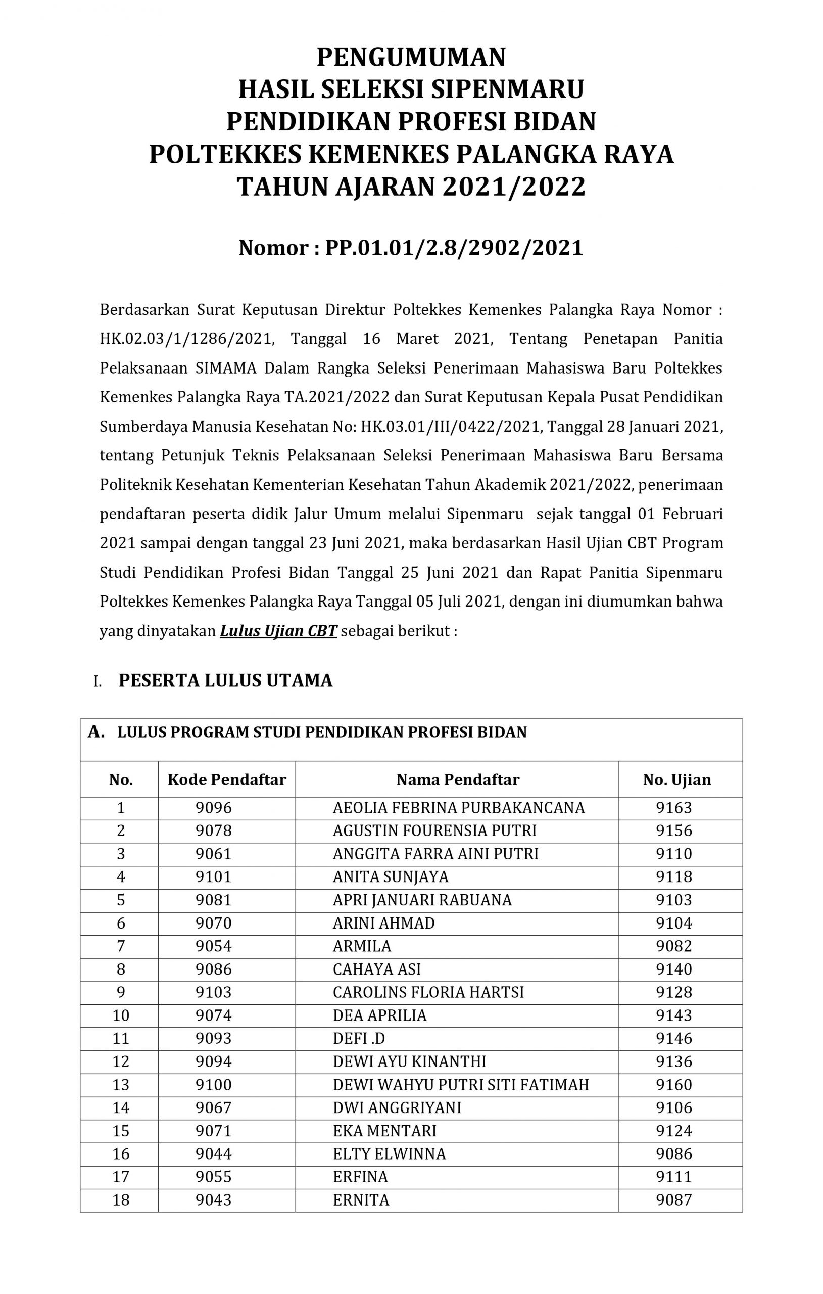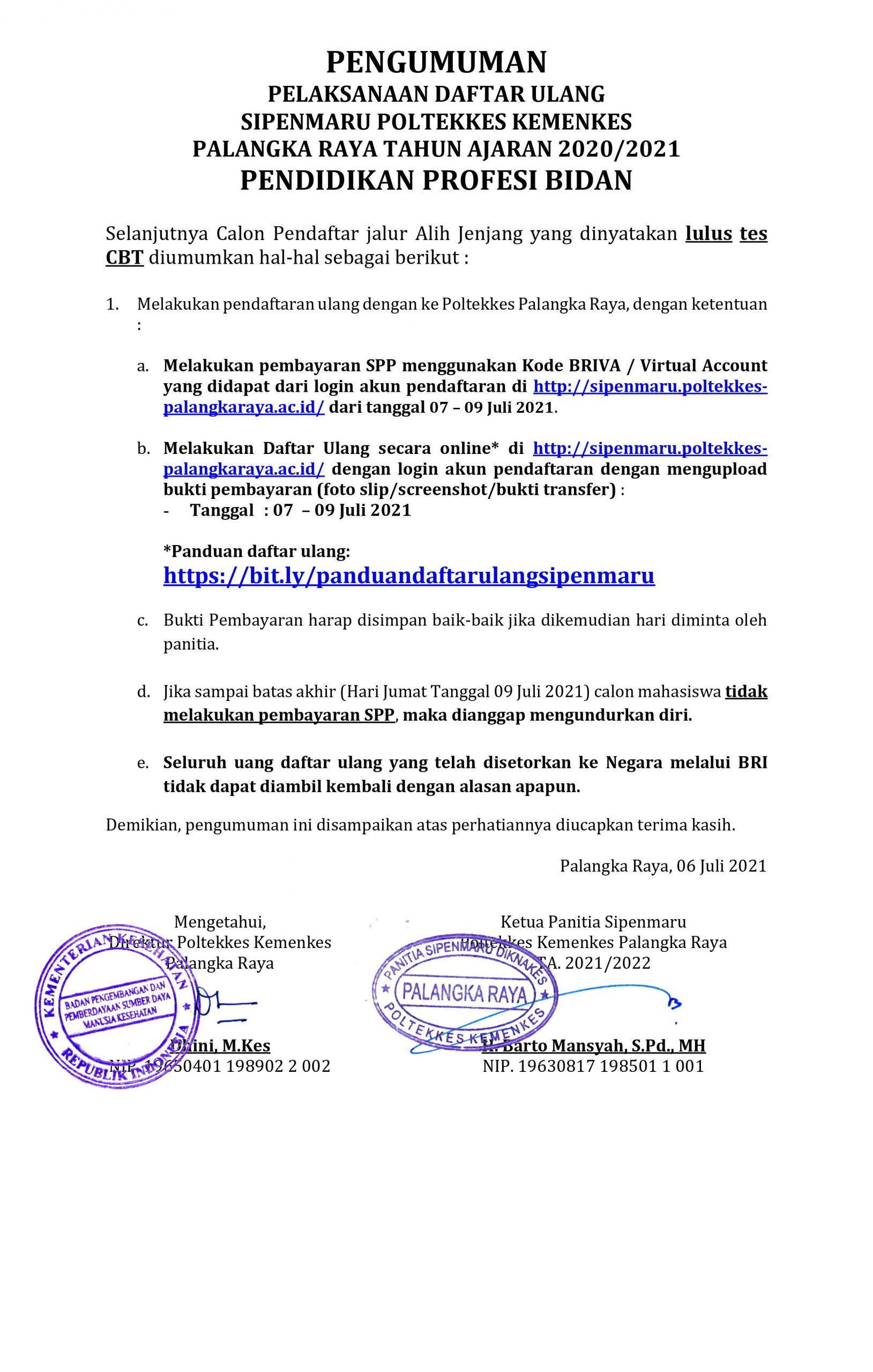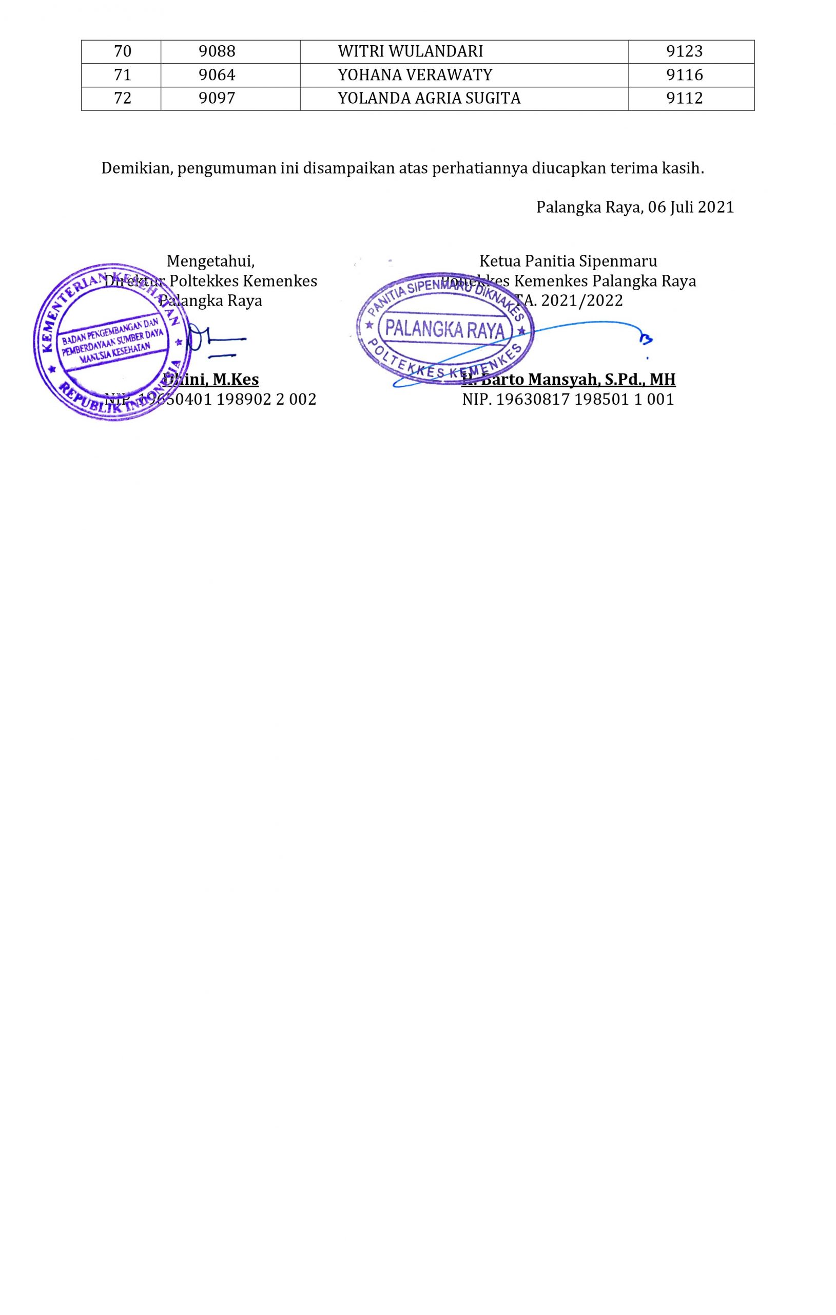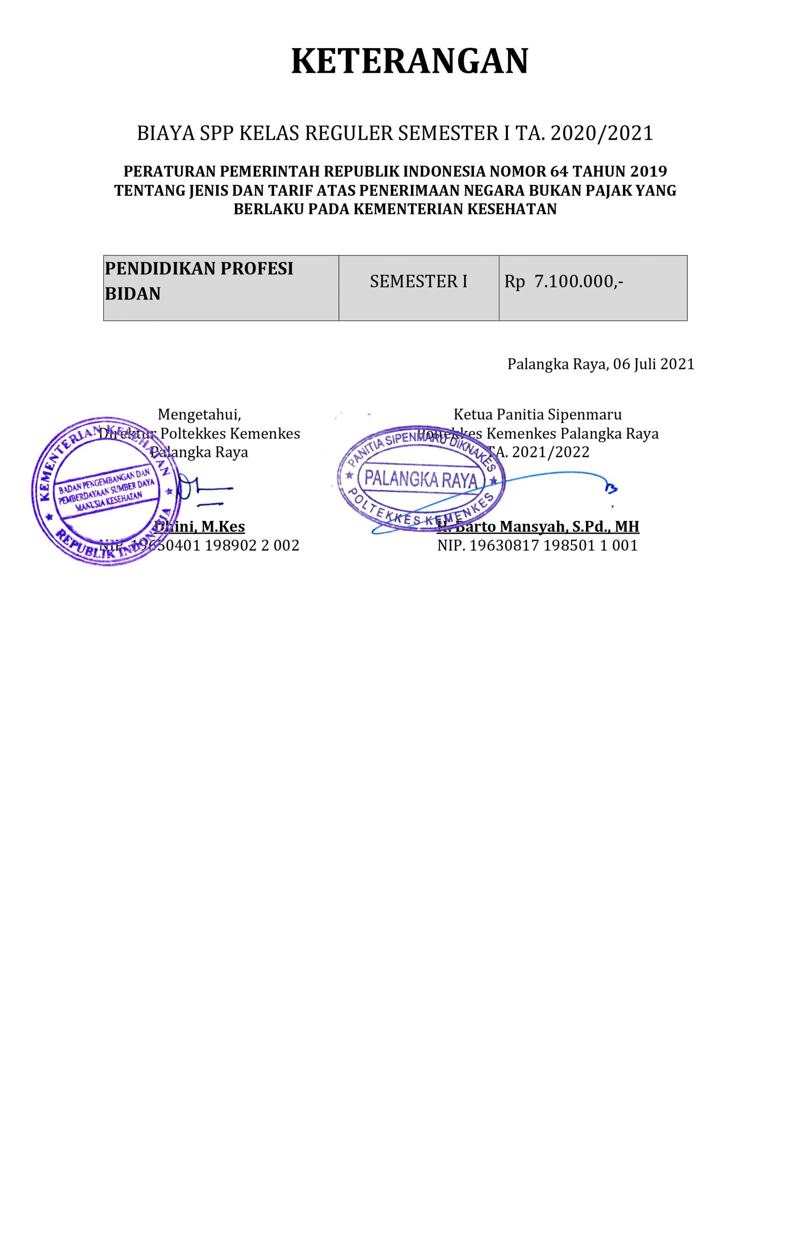 PENGUMUMAN HASIL SELEKSI SIPENMARU PENDIDIKAN PROFESI BIDAN POLTEKKES KEMENKES PALANGKA RAYA TAHUN AJARAN 2021/2022 Posted by Arif Adiguna Categories Pengumuman, Sipenmaru Date 7 July 2021 53,683 total views, 32 views today Share: Arif Adiguna Admin Web Poltekkes Previous post PENGUMUMAN KELULUSAN SIMAMI (SIPENMARU MANDIRI) KHUSUS ANGGOTA POLRI - POLTEKKES KEMENKES PALANGKA RAYA TAHUN AJARAN 2021/2022 7 July 2021 Next post Pengumuman Jadwal Pembayaran SPP Semester Ganjil T.A. 2021/2022 8 July 2021 You may also like Pelaksanaan Pembelajaran Semester Genap T.A. 2021/2022 Poltekkes Kemenkes Palangka Raya 5 January, 2022 7,274 total views, 241 views today Pengumuman Jadwal Pembayaran SPP Semester Genap T.A. 2021/2022 30 December, 2021 8,859 total views, 246 views today Pengumuman Jadwal Pembayaran SPP Semester Ganjil T.A. 2021/2022 8 July, 2021 55,391 total views, 171 views today