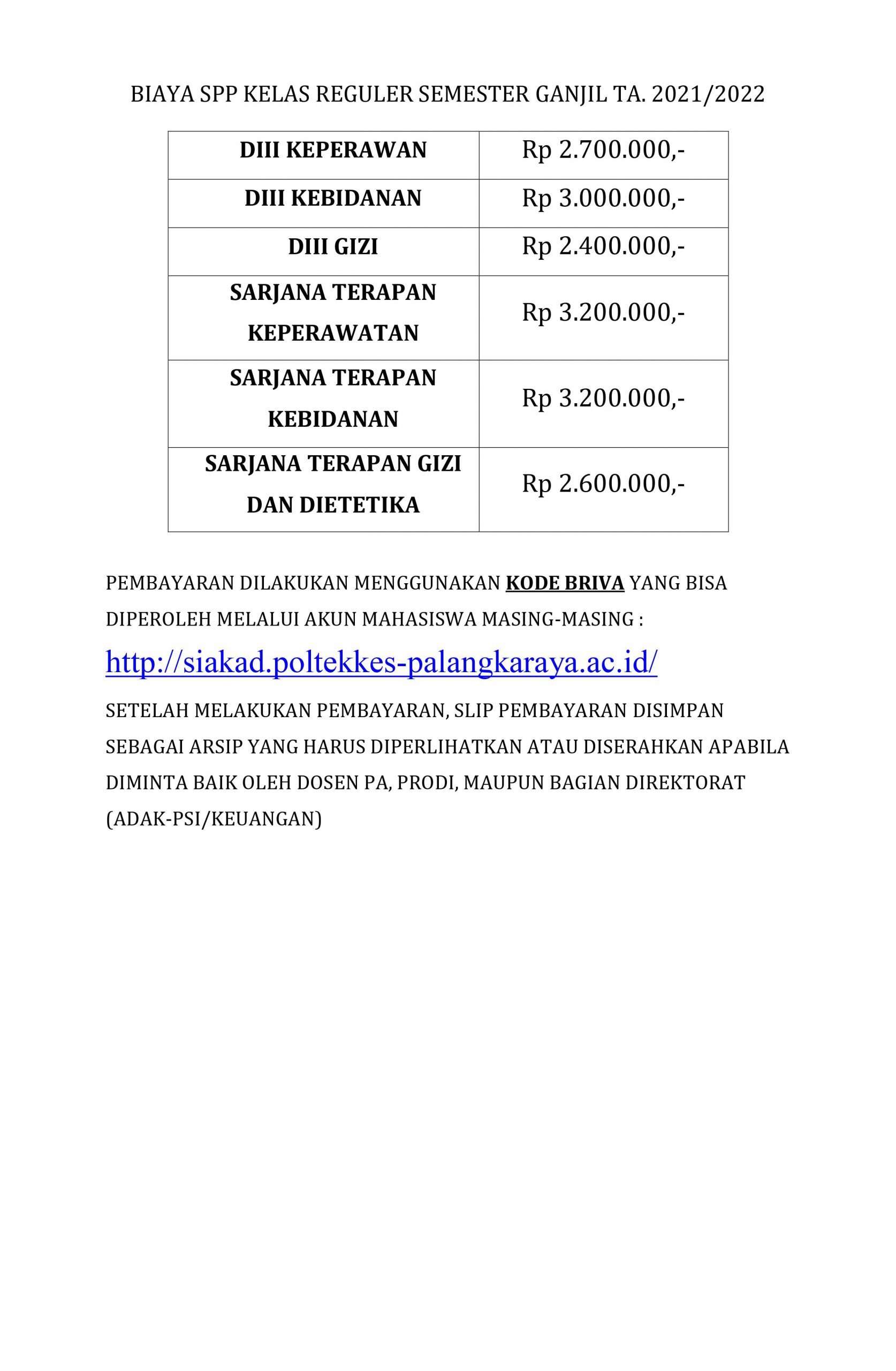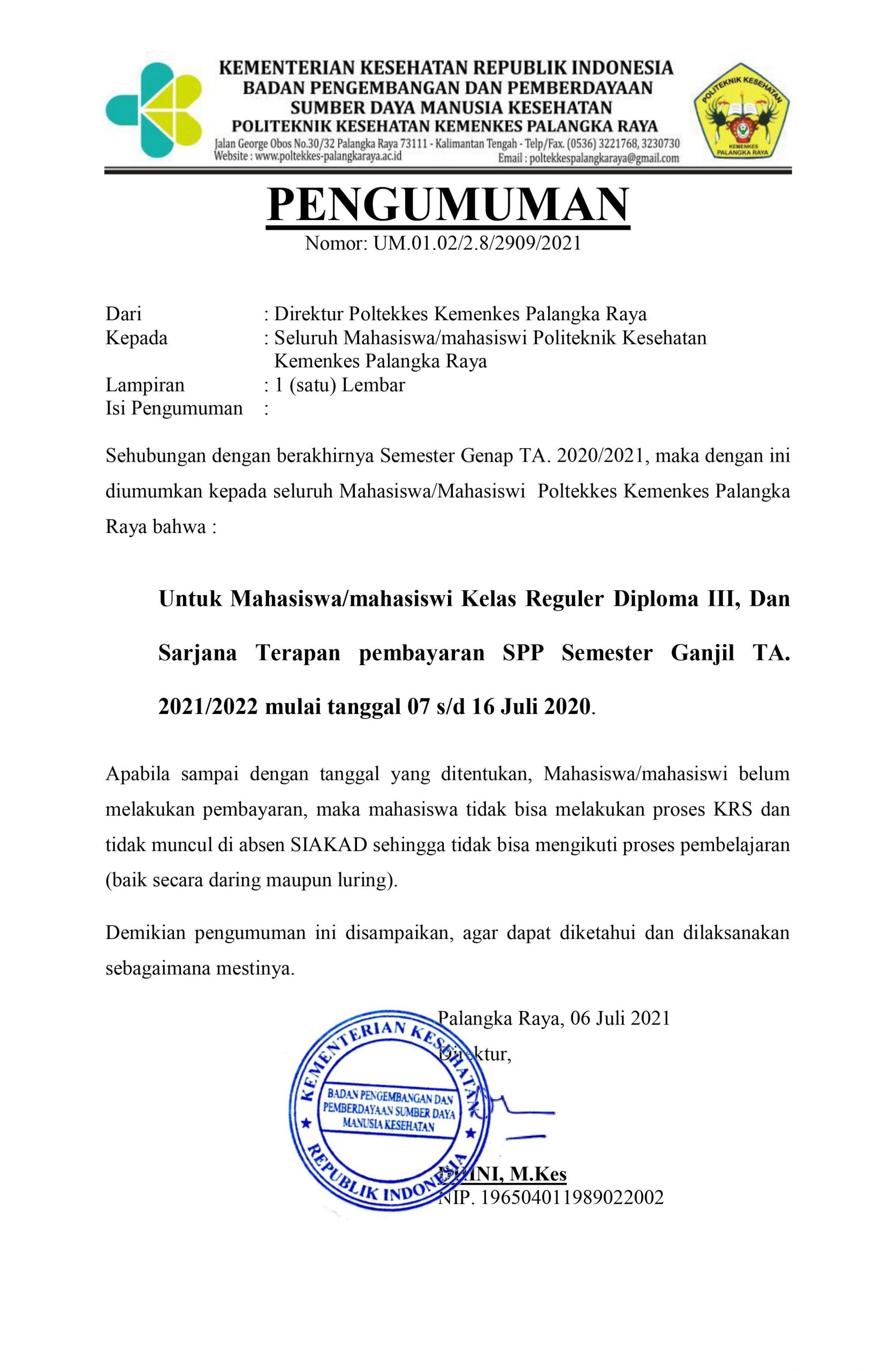 Pengumuman Jadwal Pembayaran SPP Semester Ganjil T.A. 2021/2022