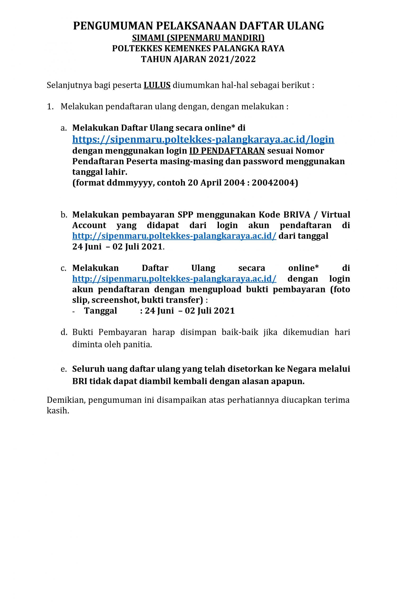 PENGUMUMAN KELULUSAN SIMAMI (SIPENMARU MANDIRI) KHUSUS ANGGOTA POLRI - POLTEKKES KEMENKES PALANGKA RAYA TAHUN AJARAN 2021/2022 Posted by Arif Adiguna Categories Pengumuman, Sipenmaru Date 23 June 2021 47,040 total views, 8 views today Share: Arif Adiguna Admin Web Poltekkes Previous post PENGUMUMAN AKHIR HASIL TES KESEHATAN LULUS CADANGAN (4) SIMAMA POLTEKKES KEMENKES PALANGKA RAYA TAHUN 2021 23 June 2021 Next post PENGUMUMAN HASIL SELEKSI SIPENMARU PENDIDIKAN PROFESI BIDAN POLTEKKES KEMENKES PALANGKA RAYA TAHUN AJARAN 2021/2022 7 July 2021 You may also like Pelaksanaan Pembelajaran Semester Genap T.A. 2021/2022 Poltekkes Kemenkes Palangka Raya 5 January, 2022 7,226 total views, 193 views today Pengumuman Jadwal Pembayaran SPP Semester Genap T.A. 2021/2022 30 December, 2021 8,810 total views, 197 views today Pengumuman Jadwal Pembayaran SPP Semester Ganjil T.A. 2021/2022 8 July, 2021 55,359 total views, 139 views today
