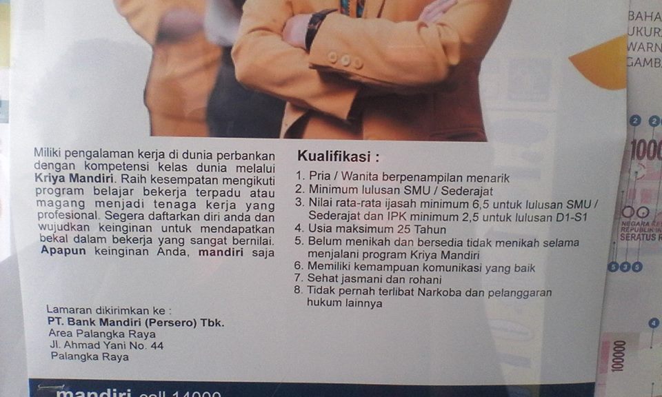 Program Kriya Mandiri Palangka Raya (Exp Date : Unknown) Posted by Arif Adiguna Categories Loker BUMN Date 8 March 2016 Comments 0 comment Share: Arif Adiguna Admin Web Poltekkes Previous post BPJS Ketenagakerjaan (CSO) (Exp. Date : 12 Maret) 8 March 2016 Next post BFI Finance P.Raya, Kasir & CS (2 Org) (Exp Date : 20 Maret) 10 March 2016 You may also like Asisten Frontliner (Teller) BNI - Min D3 Semua Jurusan (Exp Date : 8 Juni) 25 May, 2016 Penerimaan Pegawai (Tahap I) BPJS Kesehatan Tahun 2016 (Exp Date : 18 Mei) 14 May, 2016 Penerimaan Pegawai Reguler (berbagai posisi) - BPJS Ketenagakerjaan (Exp Date : 9 April) 4 April, 2016