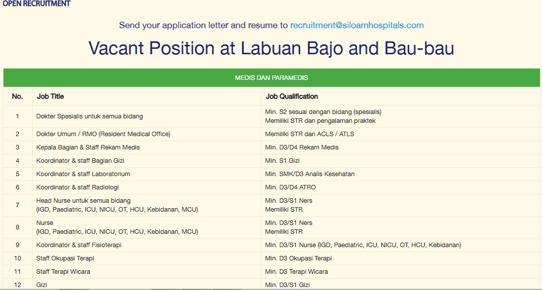 RS Siloam Hospitals (@Labuan Bajo & Bau-bau) - Tenaga Medis & Non Medis (Exp Date Secepatnya) Posted by Arif Adiguna Categories LokerKementerian Date 23 January 2016 Comments 0 comment Sumber : http://www.siloamhospitals.com/open-recruitment Tag:Loker, Lowongan, rumahsakit Share: Arif Adiguna Admin Web Poltekkes Previous post CSR Telkom - Kuala Kapuas (Exp Date 25 Jan 2016) 23 January 2016 Next post PEGAWAI KONTRAK BLUD NON PNS RSUD BANDUNG (Exp Date 29 Jan 2016) 24 January 2016 You may also like Rekrutmen Tenaga Kontrak RSUD Dr. H. Moch. Ansari Saleh Banjarmasin (EXP DATE : 20 Juli) 19 July, 2016 Penerimaan Pegawai (Tahap I) BPJS Kesehatan Tahun 2016 (Exp Date : 18 Mei) 14 May, 2016 INFO CPNS: Penerimaan PNS di Lingkungan Pemerintah Daerah dari PTT di Kementerian Kesehatan 2016 11 May, 2016