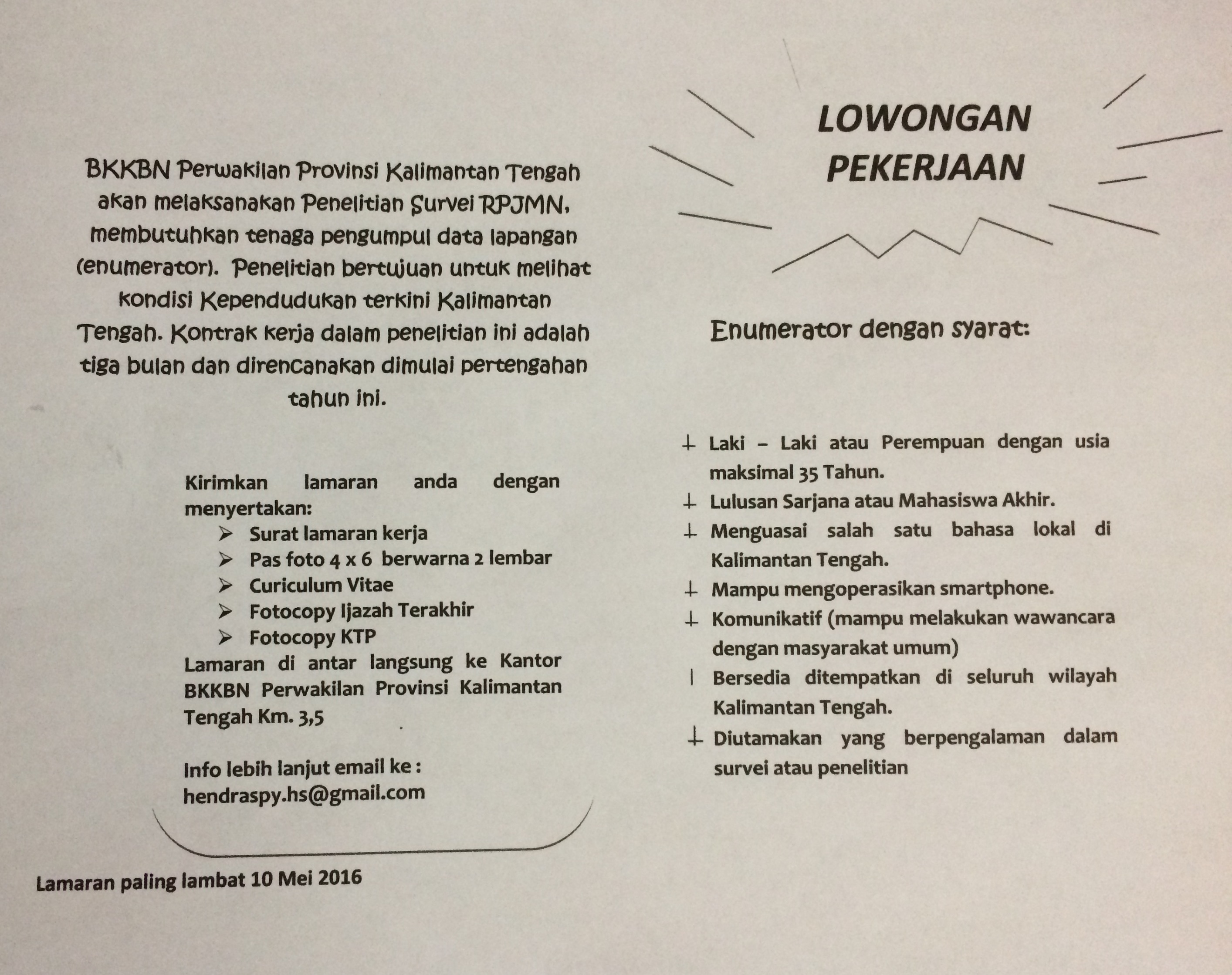 Tenaga Enumerator BKKBN Kalteng, Exp Date 10 Mei 2016 Posted by Bagus Indriatmojo Categories LokerKementerian Date 2 May 2016 Comments 0 comment Share: Bagus Indriatmojo Admin Web Poltekkes Previous post Inilah Fakta Keberhasilan Pengendalian Malaria 2 May 2016 Next post Lomba Menulis Artikel Ilmiah Populer (Exp Date : 25 Juni) 3 May 2016 You may also like Rekrutmen Tenaga Kontrak RSUD Dr. H. Moch. Ansari Saleh Banjarmasin (EXP DATE : 20 Juli) 19 July, 2016 Penerimaan Pegawai (Tahap I) BPJS Kesehatan Tahun 2016 (Exp Date : 18 Mei) 14 May, 2016 INFO CPNS: Penerimaan PNS di Lingkungan Pemerintah Daerah dari PTT di Kementerian Kesehatan 2016 11 May, 2016