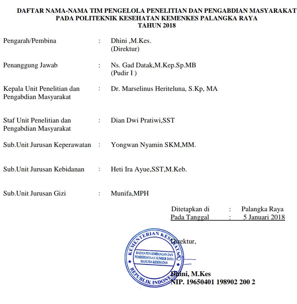 - Perumusan program penelitian dan pengabdian masyarakat di bidang kesehatan pada lingkup Poltekkes Kemenkes Palangka Raya.