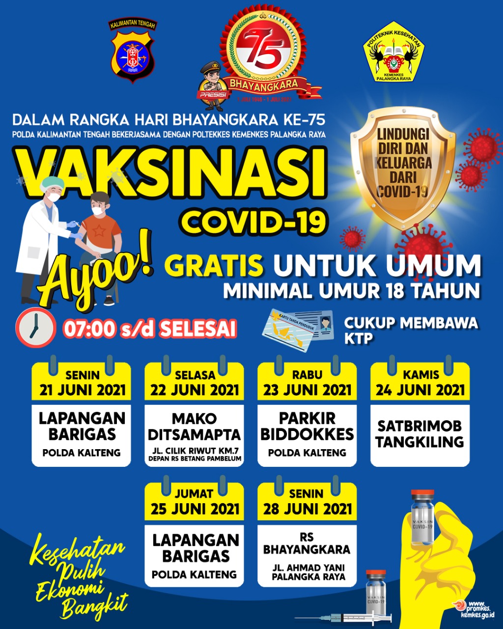 Dalam Rangka Hari Bhayangkara Ke-75, Polda Kalimantan Tengah Bekerjasama dengan Poltekkes Kemenkes Palangka Raya Menyelenggarakan Vaksinasi Covid-19 Gratis.